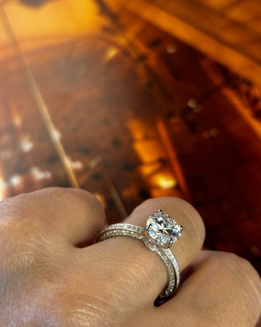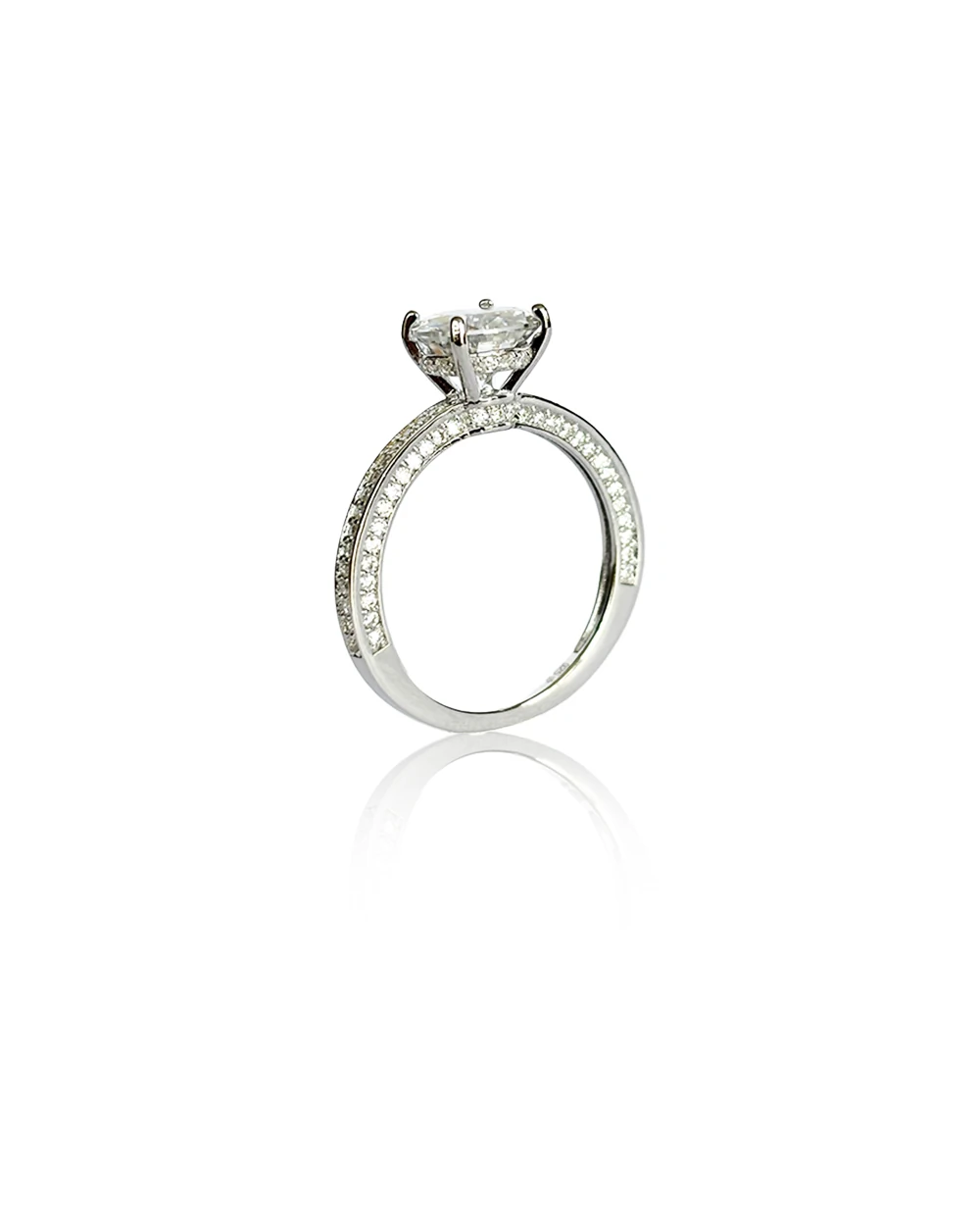 Anel solitário em prata 925 com banho de ródio, delicadamente cravejado no aro e coroado por uma moissanite de 8mm. Uma joia de brilho eterno que transmite elegância em cada detalhe.