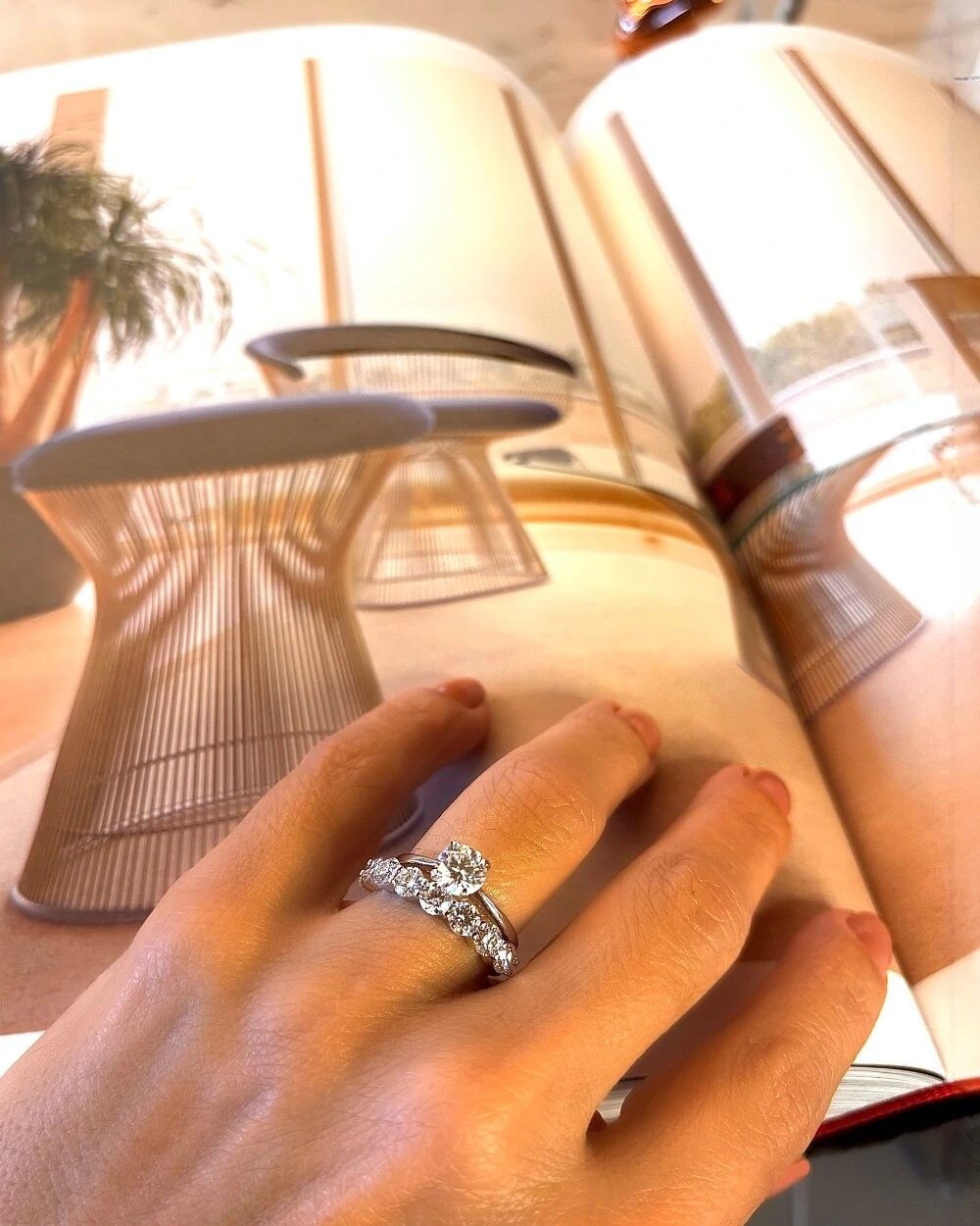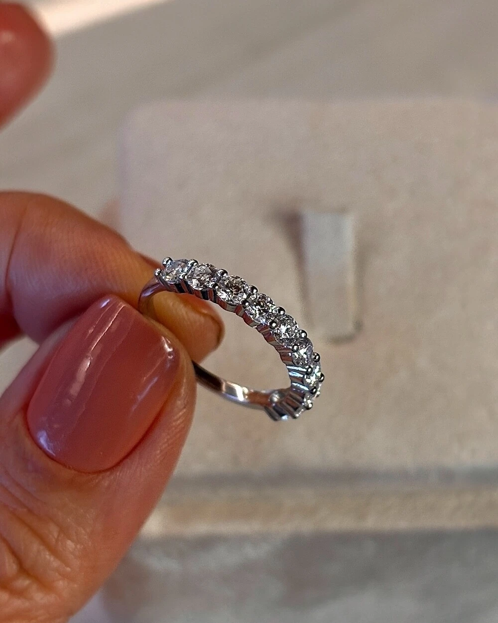 Meia aliança em prata 925 com banho de ródio, composta por 8 moissanites de 4mm. Uma peça de brilho marcante e sofisticado, ideal para eternizar vínculos e realçar a beleza em qualquer ocasião.