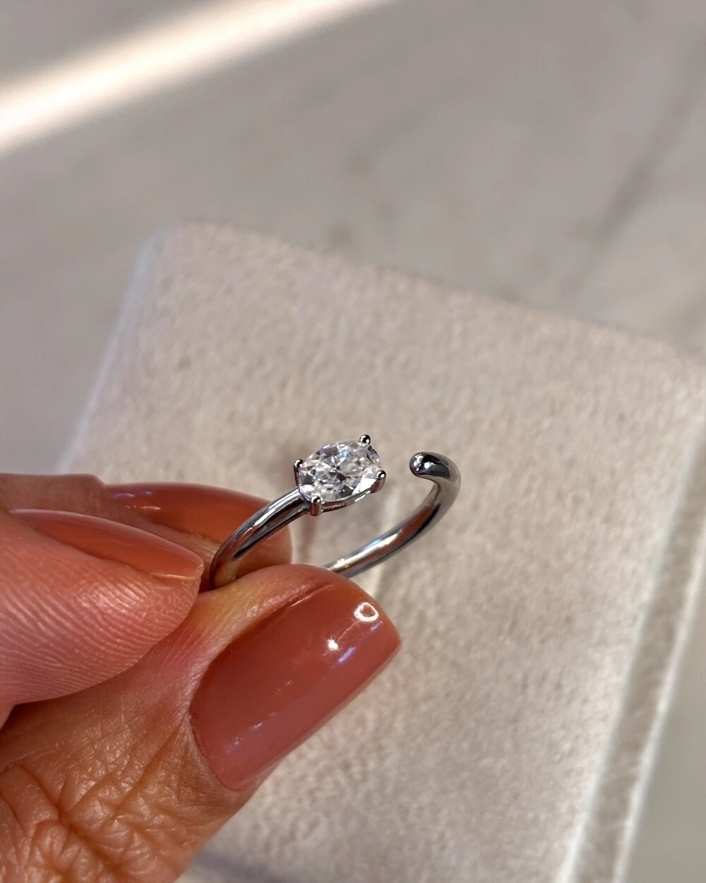 Anel aberto em prata 925 com banho de ródio, adornado por uma moissanite em corte oval. Uma joia moderna e elegante, que combina design contemporâneo com o brilho eterno da moissanite.
