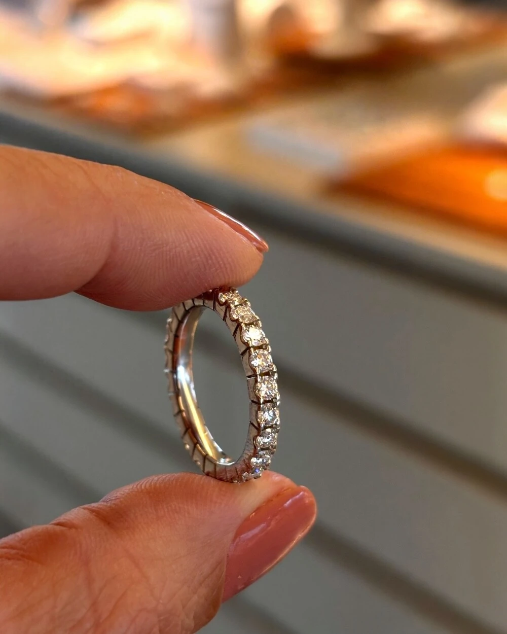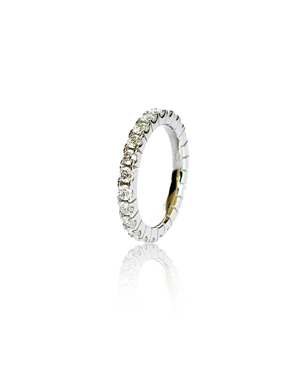 Aliança inteira maciça em prata 925 com banho de ródio, totalmente cravejada com moissanites. Uma joia de esplendor contínuo, símbolo de eternidade e sofisticação em cada detalhe.