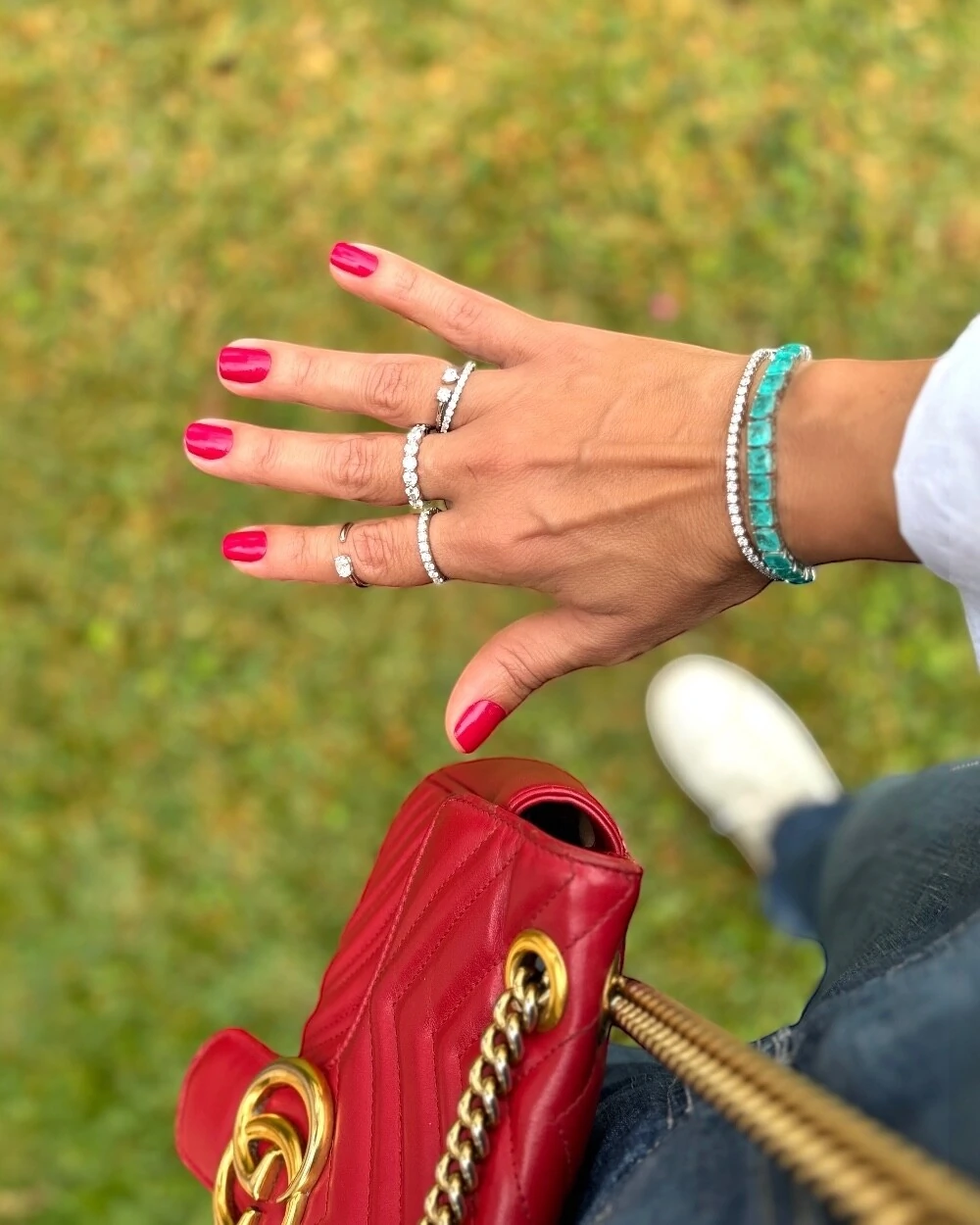 Pulseira riviera em prata 925 com banho de ródio, composta por pedras carrê de turmalina Paraíba fusion. Uma joia vibrante e elegante, que une o frescor da cor ao design clássico e atemporal.