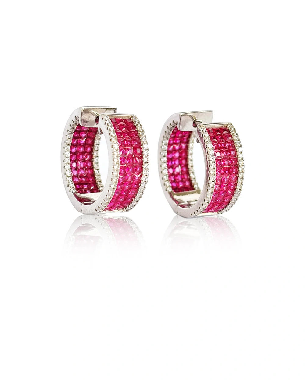 Argola em prata 925 com banho de ródio, com cravação invisible de zircônias e rubi fusion, tanto na parte interna quanto externa. Uma joia impactante e refinada, que revela intensidade de cor e brilho em todos os ângulos.